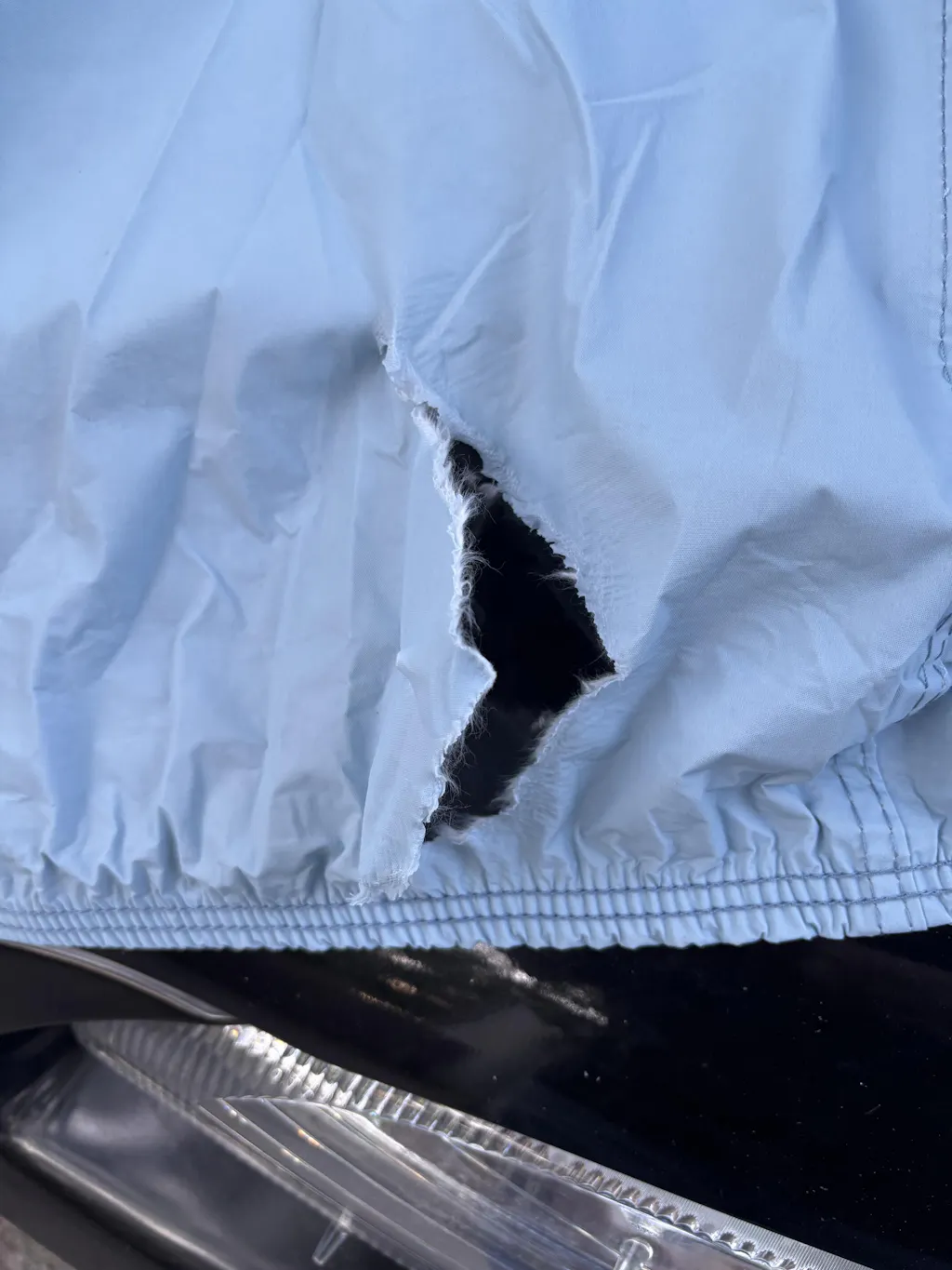 The Mustang's version arrived with a slight 3-4" rip at the very bottom front, but since it isn't in an exposed location, and there's no way a normal human can refold it ;-), I don't see any reason to ask for a return.